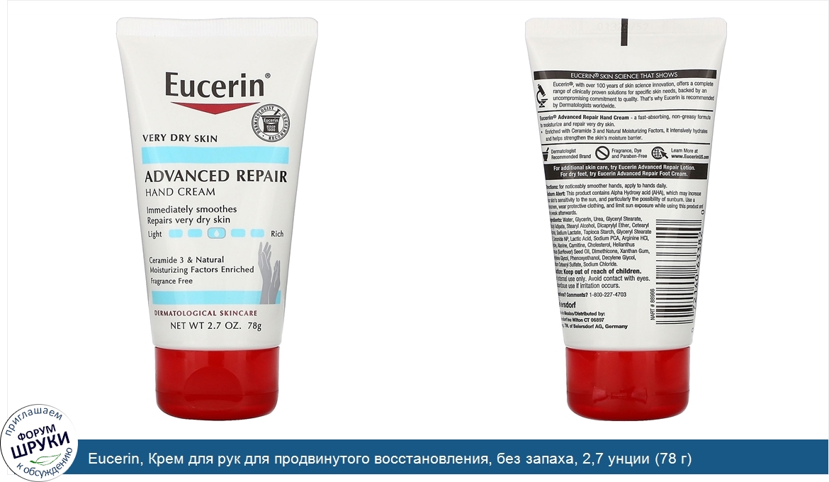 Друзья, если у вас есть отзыв/дополнение/комментарий/вопрос относительно Eucerin, Крем для рук для продвинутого восстановления, без запаха, 2,7 унции (78 г) - напишите его ответом в эту тему (это будет полезно всему сообществу в целом и вам в отдельности).