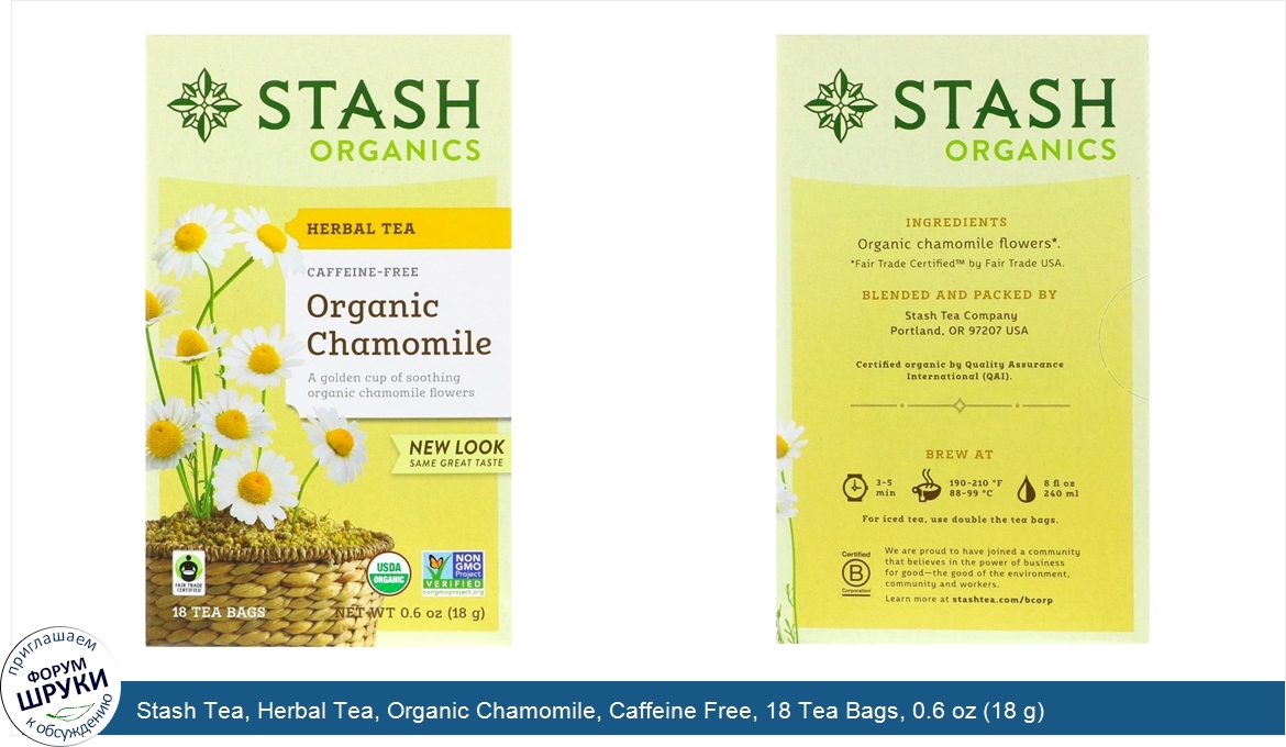 [DESCRIPT]Non GMO Project Verified. Certified B Corporation. Kosher Pareve. Certified Organic by Quality Assurance International. Fair Trade Certified. A gold cup of soothing organic chamomile flowers. - Herbal Tea -. Unwind after a long day with the comforting apple nectar flavor of our Fair Trade Certified organic chamomile. Crafted to offer a moment of serenity, this naturally enhancing tea is a small dose of happiness brewed just for you. Explore. -. Our. -. World of Tea. At stash, we aren't just makers of tea, we're tea people. We carefully select our organic teas, herbs and spices to meet our exacting standards to bring you the most flavorful, all-natural organic tea blends. Yet we believe in more than just creating great teas. We partner with farmers and suppliers who share our priorities of quality, environmental stewardship, and progressive human rights. Together, we strive to create a more sustainable future for our local and global communities. Tea is in our soul, and we exist to share that dedication in every cup.[/DESCRIPT]... (описание дополняется)