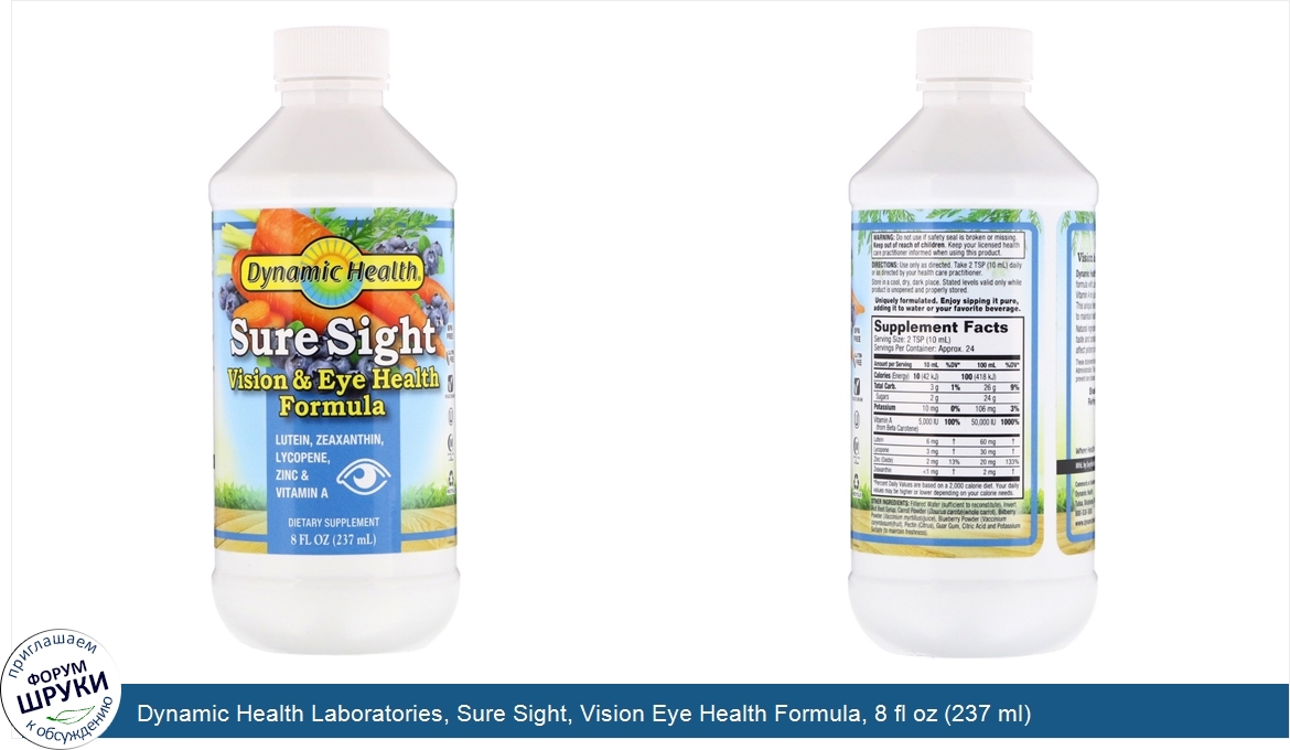 [DESCRIPT]BPA Free. Gluten Free. Vegetarian. Kosher. Halal. Lutein, Zeaxanthin, Lycopene, Zinc Vitamin A. Dietary Supplement. Where Health Flavor Meet! Sure Sight Vision Eye Health Formula. Dynamic Health Sure Sight is a delicious proprietary formula with Lutein, Zeaxanthin, Lycopene, Zinc and Vitamin A in a juice blend of Carrot, Bilberry and Blueberry. This unique blend is formulated to help provide support to maintain healthy vision and eye health. Natural ingredients in this product can vary the color, taste and consistency from batch to batch. This does not affect potency or quality.[/DESCRIPT]... (описание дополняется)