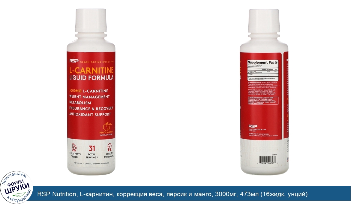 RSP Nutrition, L-карнитин, коррекция веса, персик и манго, 3000мг, 473мл (16жидк. унций)