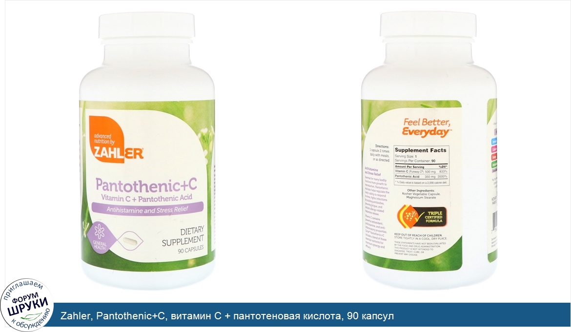 [DESCRIPT]Advanced Nutrition by Zahler. Antihistamine and Stress Relief. General Health. Dietary Supplement. Feel Better, Everyday. Triple Certified Formula. Kosher Pareve. This Product is Manufactured in an NSF GMP Certified Facility. Antihistamine and Stress Relief. Essential for many bodily functions from growth to reproduction, Pantothenic Acid also helps regulate the body's ability to respond to stress, fights infections by building antibodies, prevents fatigue, and inhibits allergy-related histamine release. Vitamin C contains powerful antioxidant antihistamine, and anti-inflammatory properties. Zahler Pantothenic + C includes a blend of these essential nutrients for maximum synergy and efficacy. Effective for the Following Indications:. Stress. Inflammation. Allergies. Immune System Disorders.[/DESCRIPT]... (описание дополняется)
