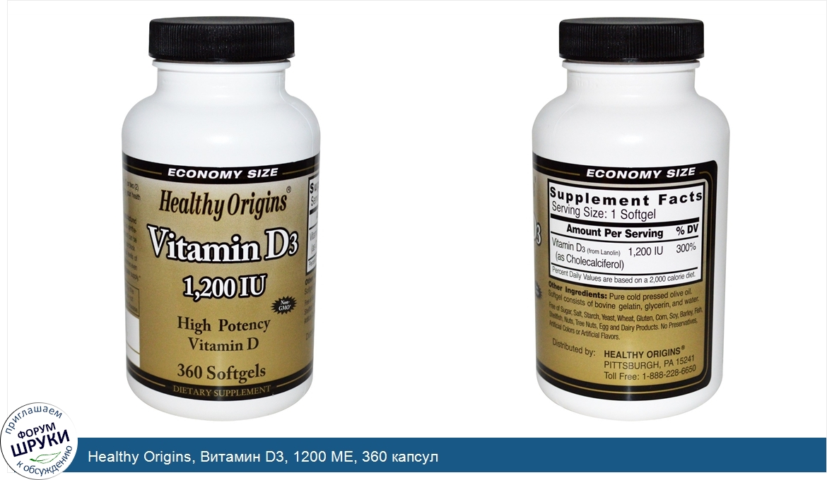 ru Healthy Origins, Витамин D3, 1200 МЕ, 360 капсул