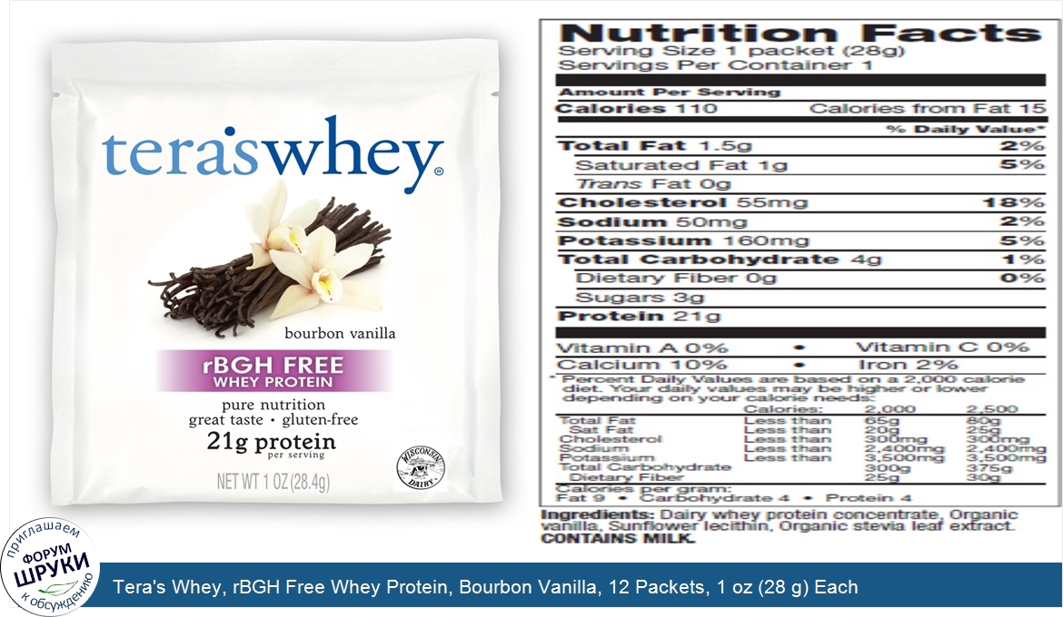 Друзья, если у вас есть отзыв/дополнение/комментарий/вопрос относительно Tera's Whey, rBGH Free Whey Protein, Bourbon Vanilla, 12 Packets, 1 oz (28 g) Each - напишите его ответом в эту тему (это будет полезно всему сообществу в целом и вам в отдельности).