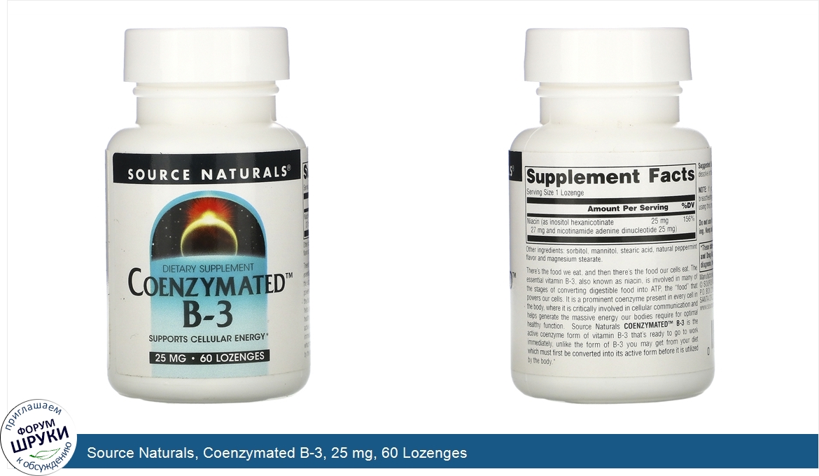 [DESCRIPT]Dietary Supplement. Supports Cellular Energy. There’s the food we eat, and then there's the food our cells eat. The essential vitamin B-3, also known as niacin, is involved in many of the stages of converting digestible food into ATP, the "food" that powers our cells. It is a prominent coenzyme present in every cell in the body, where it is critically involved in cellular communication and helps generate the massive energy our bodies require for optimal healthy function. Source Naturals COENZYMATEDTM™ B-3 is the active coenzyme form of vitamin B-3 that's ready to go to work immediately, unlike the form of B-3 you may get from your diet which must first be converted into its active form before it is utilized by the body.[/DESCRIPT]... (описание дополняется)