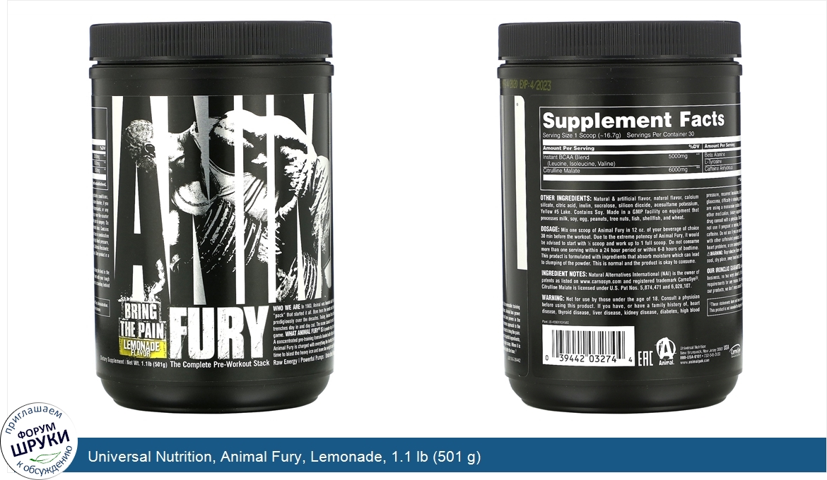 Universal Nutrition, Animal Fury, Lemonade, 1.1 lb (501 g)