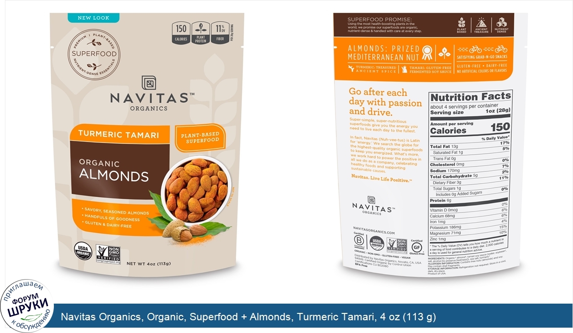[DESCRIPT]Premium. Plant-Based Superfood. Nutrient-Dense Essentials. 150 Calories - Plant Protein -11% DV Fiber Per 28 g Serving. Savory, Seasoned Almonds. Handfuls of Goodness. Gluten Dairy-Free. Navitas. Live Life Positive. USDA Organic. Non GMO Project Verified. Live Life Positive. Positive Mind - Positive Vibes - Positive Life. Ancient Treasure. Almonds: Prized Mediterranean Nut. Turmeric: Treasured Ancient Spice. Tamari: Gluten-Free Fermented Soy Sauce. Satisfying Grab-N-Go Snacks. Certified B Corporation. Vegan. BPA Free. Superfood Promise:. Using the most health-boosting plants in the world, we promise our superfoods are organic, nutrient-dense handled with care at every step. Go after each day with passion and drive. Super-simple, super-nutritious superfoods give you the energy you need to live each day to the fullest. In fact, Navitas (Nuh-vee-tus) is Latin for 'energy.' We search the globe for the highest-quality organic superfoods to keep you energized. What's more, we work hard to power the positive in all we do as a company, celebrating healthy foods and supporting sustainable causes.[/DESCRIPT]... (описание дополняется)