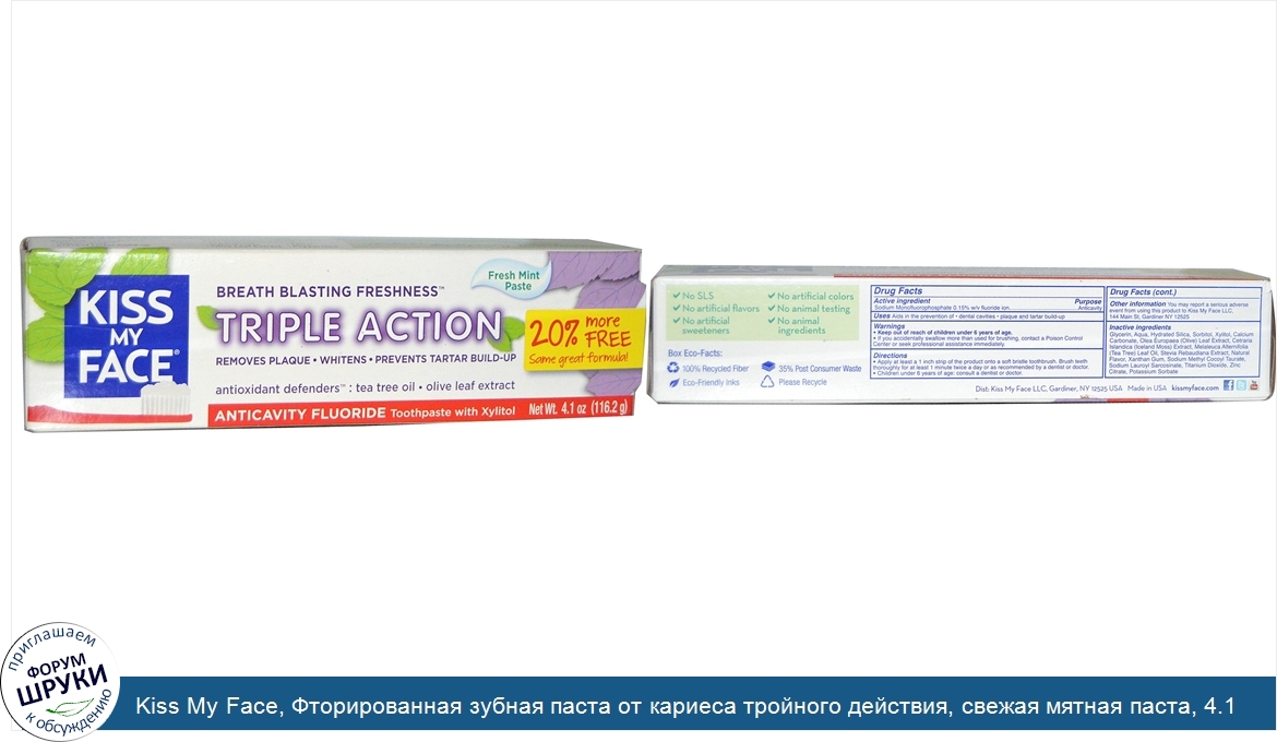 Друзья, если у вас есть отзыв/дополнение/комментарий/вопрос относительно Kiss My Face, Фторированная зубная паста от кариеса тройного действия, свежая мятная паста, 4.1 унций (116.2 г) - напишите его ответом в эту тему (это будет полезно всему сообществу в целом и вам в отдельности).