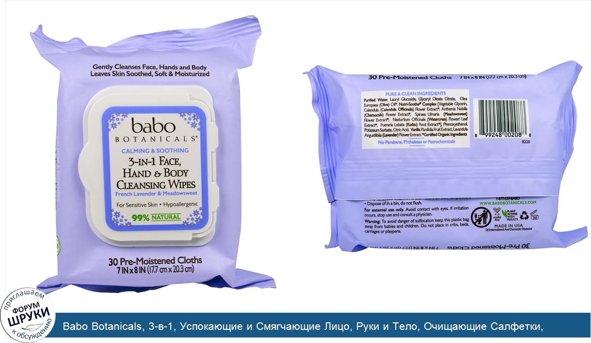 Друзья, если у вас есть отзыв/дополнение/комментарий/вопрос относительно Babo Botanicals, 3-в-1, Успокающие и Смягчающие Лицо, Руки и Тело, Очищающие Салфетки, Французская Лаванда и Таволга, 30 Влажных Салфеток - напишите его ответом в эту тему (это будет полезно всему сообществу в целом и вам в отдельности).