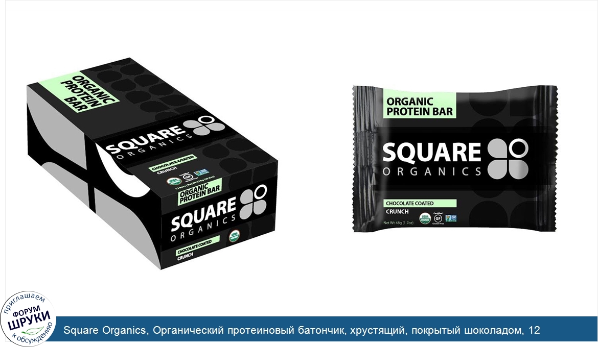 Square Organics, Органический протеиновый батончик, хрустящий, покрытый шоколадом, 12 батончиков, 1,7 унции (48 г) каждый