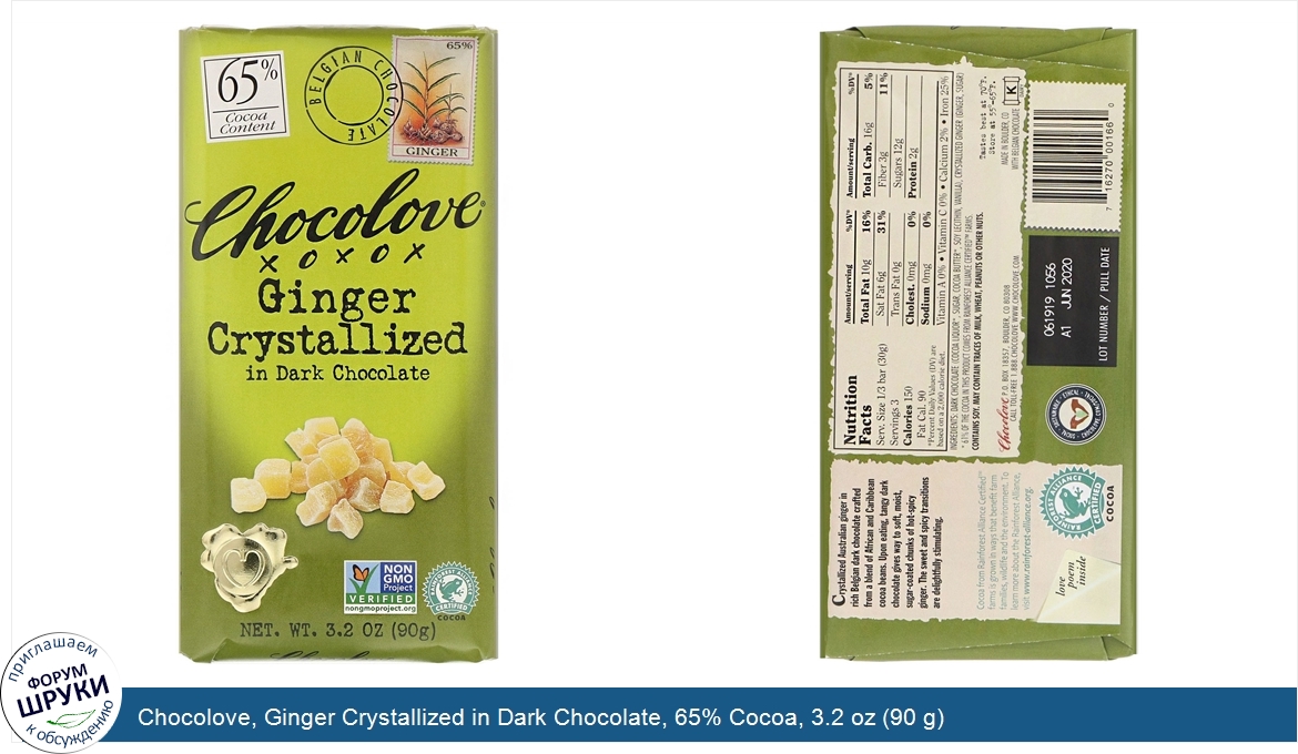 Друзья, если у вас есть отзыв/дополнение/комментарий/вопрос относительно Chocolove, Ginger Crystallized in Dark Chocolate, 65% Cocoa, 3.2 oz (90 g) - напишите его ответом в эту тему (это будет полезно всему сообществу в целом и вам в отдельности).