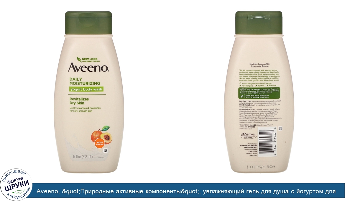 Друзья, если у вас есть отзыв/дополнение/комментарий/вопрос относительно Aveeno, "Природные активные компоненты", увлажняющий гель для душа с йогуртом для ежедневного использования, абрикосово-медовый, 18 жидких унций (532 мл) - напишите его ответом в эту тему (это будет полезно всему сообществу в целом и вам в отдельности).