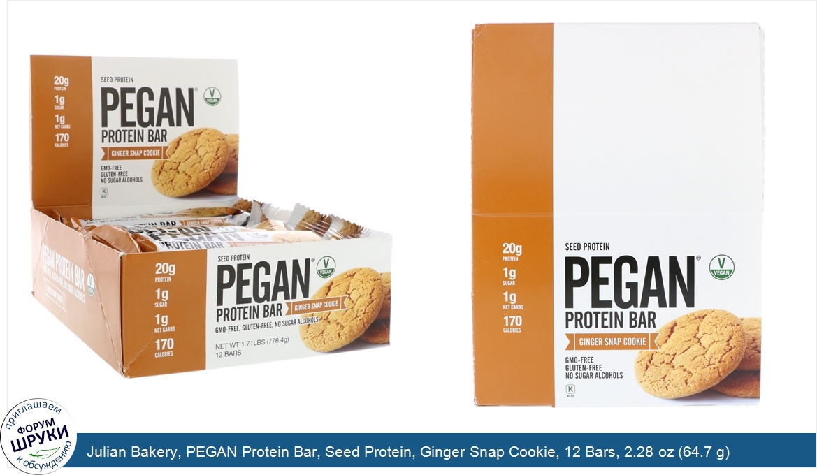 Julian Bakery, PEGAN Protein Bar, Seed Protein, Ginger Snap Cookie, 12 Bars, 2.28 oz (64.7 g) Each