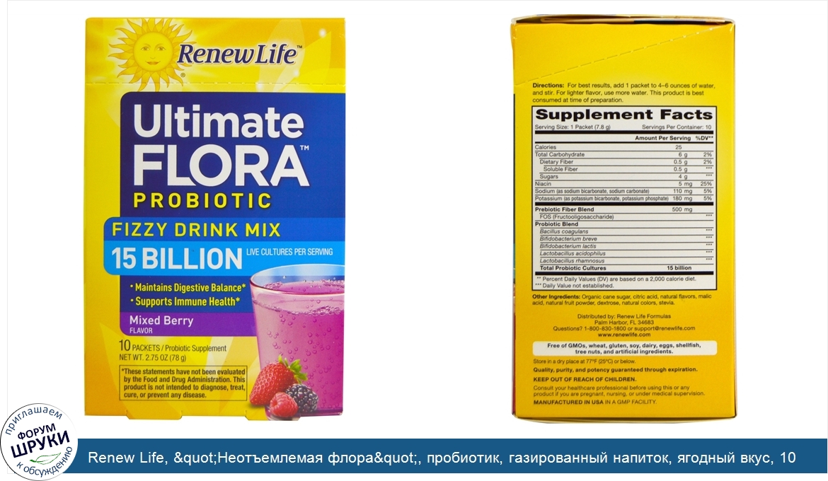 Друзья, если у вас есть отзыв/дополнение/комментарий/вопрос относительно Renew Life, "Неотъемлемая флора", пробиотик, газированный напиток, ягодный вкус, 10 пакетиков, 2,75 унций (78 г) - напишите его ответом в эту тему (это будет полезно всему сообществу в целом и вам в отдельности).