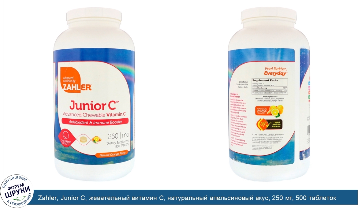 Друзья, если у вас есть отзыв/дополнение/комментарий/вопрос относительно Zahler, Junior C, жевательный витамин C, натуральный апельсиновый вкус, 250 мг, 500 таблеток - напишите его ответом в эту тему (это будет полезно всему сообществу в целом и вам в отдельности).