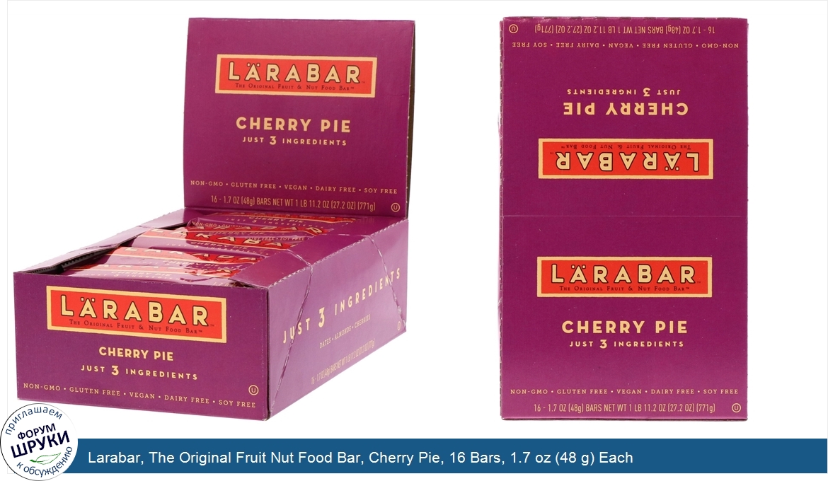 Друзья, если у вас есть отзыв/дополнение/комментарий/вопрос относительно Larabar, The Original Fruit Nut Food Bar, Cherry Pie, 16 Bars, 1.7 oz (48 g) Each - напишите его ответом в эту тему (это будет полезно всему сообществу в целом и вам в отдельности).