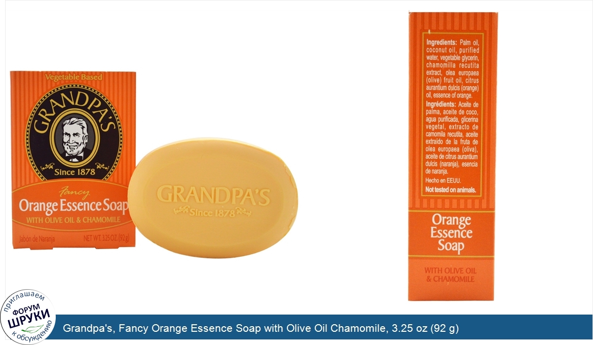 Друзья, если у вас есть отзыв/дополнение/комментарий/вопрос относительно Grandpa's, Fancy Orange Essence Soap with Olive Oil Chamomile, 3.25 oz (92 g) - напишите его ответом в эту тему (это будет полезно всему сообществу в целом и вам в отдельности).