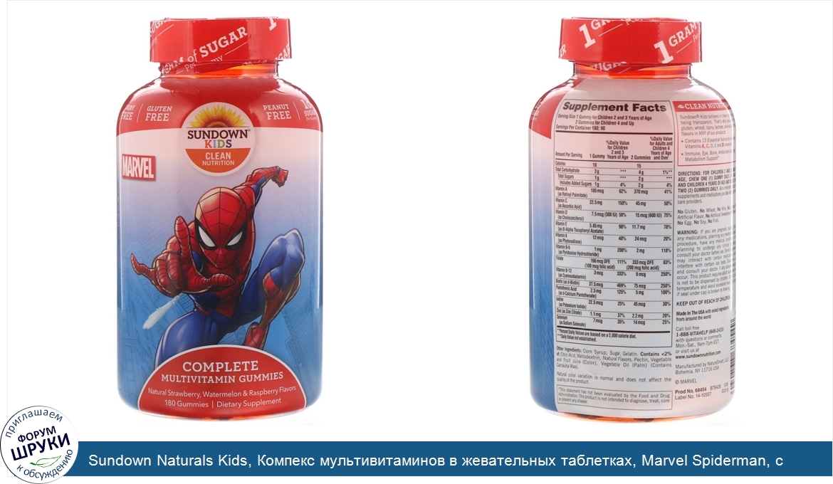 Друзья, если у вас есть отзыв/дополнение/комментарий/вопрос относительно Sundown Naturals Kids, Компекс мультивитаминов в жевательных таблетках, Marvel Spiderman, с натуральными ароматизатороами клубники, арбуза и малины, 180 жевательных таблеток - напишите его ответом в эту тему (это будет полезно всему сообществу в целом и вам в отдельности).