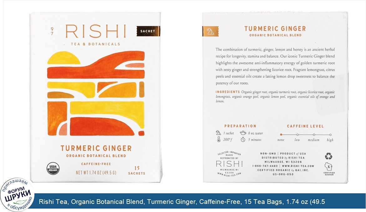 [DESCRIPT]Tea Botanicals. USDA Organic. Caffeine Level: None. Non-GMO. Certified Organic by QAI. Certified Kosher. The combination of turmeric, ginger, lemon and honey is an ancient herbal recipe for longevity, stamina and balance. Our iconic Turmeric Ginger blend highlights the awesome anti-inflammatory energy of golden turmeric root with zesty ginger and strengthening licorice root. Fragrant lemongrass, citrus peels and essential oils create a lasting lemon drop sweetness to balance the potency of our roots. Independently. Owned. since 1997, Rishi is the vanguard source of direct trade tea and botanicals. We are selectors, importers and makers. Selector. : We are a team devoted to traveling the more remote regions of the world to source and study tea and botanicals of rarefied quality and provenance. Our selection sets the standard. Importer. : We are a pioneer of the organic tea and botanicals which we import on a direct trade basis from artisan growers and specialist producers. Our global supply chain and enduring relationships are our core strengths. Maker. : We make artful botanical products inspired by equal parts ancient herbal tradition and modern culinary innovation. By sharing our passion for herbal and culinary arts, we aim to be a wellspring of inspiration for your tea life. Direct Trade. Our Practice. of Direct Trade is not just a romance story or marketing gimmick; it is very foundation of our quality control program. Our travel and hands-on work with farmers allows us to verify where, when and how our organic teas are grown and to offer traceability on each lot back to the farm. Health Wellness. The reverence and study of plants is at the core of our identity. We believe that health and wellness begins in the garden and kitchen. Crafted for both function and flavor, our tea and botanical blends are created to be the pillar of your pursuit for balance.[/DESCRIPT]... (описание дополняется)