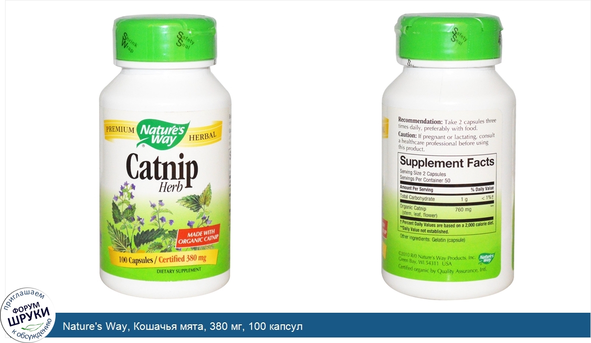 Друзья, если у вас есть отзыв/дополнение/комментарий/вопрос относительно Nature's Way, Кошачья мята, 380 мг, 100 капсул - напишите его ответом в эту тему (это будет полезно всему сообществу в целом и вам в отдельности).