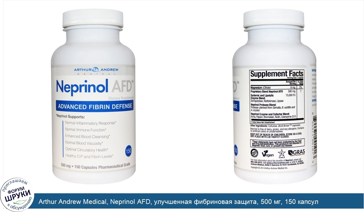Друзья, если у вас есть отзыв/дополнение/комментарий/вопрос относительно Arthur Andrew Medical, Neprinol AFD, улучшенная фибриновая защита, 500 мг, 150 капсул - напишите его ответом в эту тему (это будет полезно всему сообществу в целом и вам в отдельности).