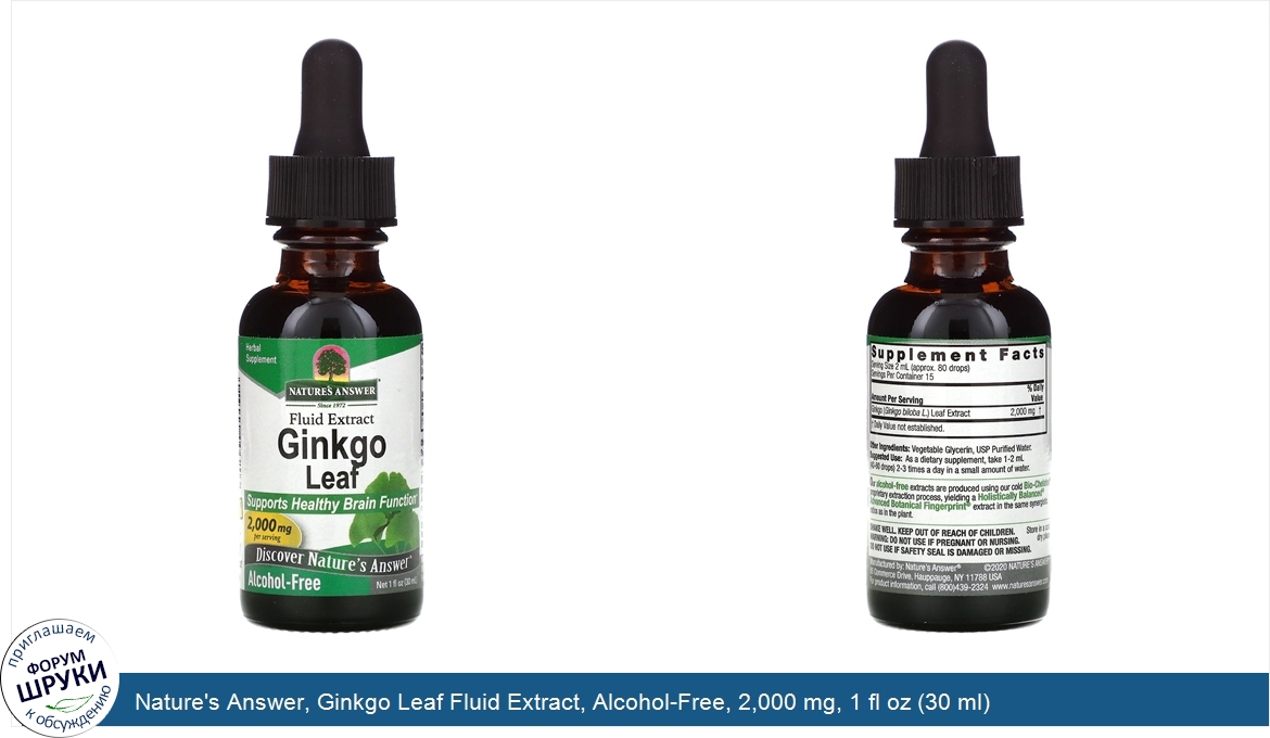 Друзья, если у вас есть отзыв/дополнение/комментарий/вопрос относительно Nature's Answer, Ginkgo Leaf Fluid Extract, Alcohol-Free, 2,000 mg, 1 fl oz (30 ml) - напишите его ответом в эту тему (это будет полезно всему сообществу в целом и вам в отдельности).