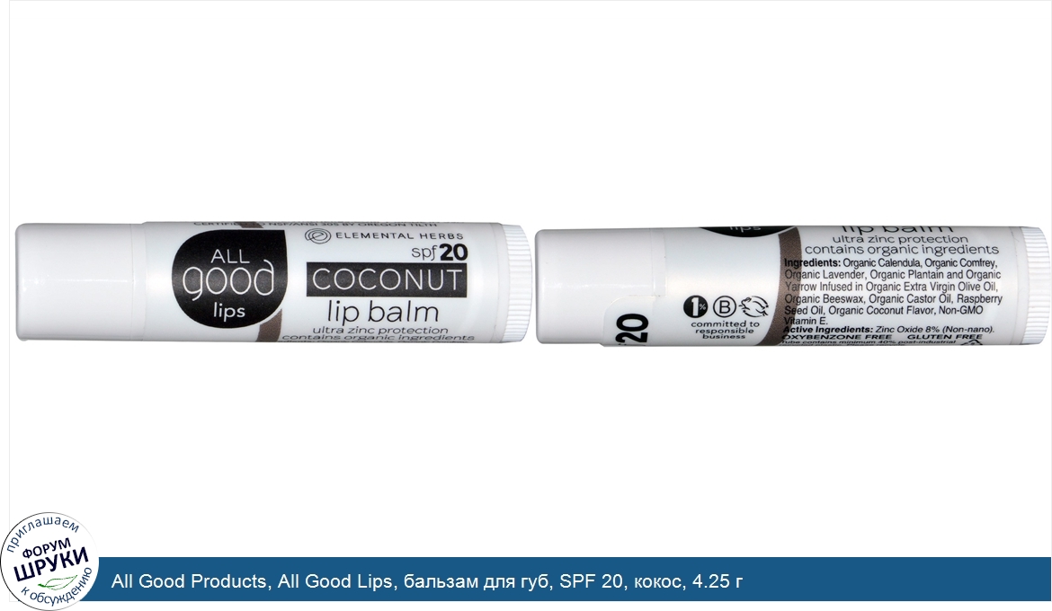 Друзья, если у вас есть отзыв/дополнение/комментарий/вопрос относительно All Good Products, All Good Lips, бальзам для губ, SPF 20, кокос, 4.25 г - напишите его ответом в эту тему (это будет полезно всему сообществу в целом и вам в отдельности).