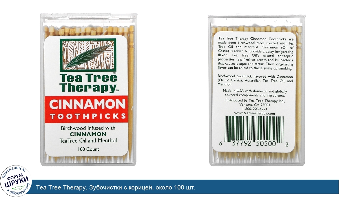 Березовая древесина с корицей, маслом чайного дерева и ментолом. Зубочистки с корицей от Tea Tree Therapy изготавливаются из березовой древесины, обработанной маслом чайного дерева и ментолом. Корица (масло касси...