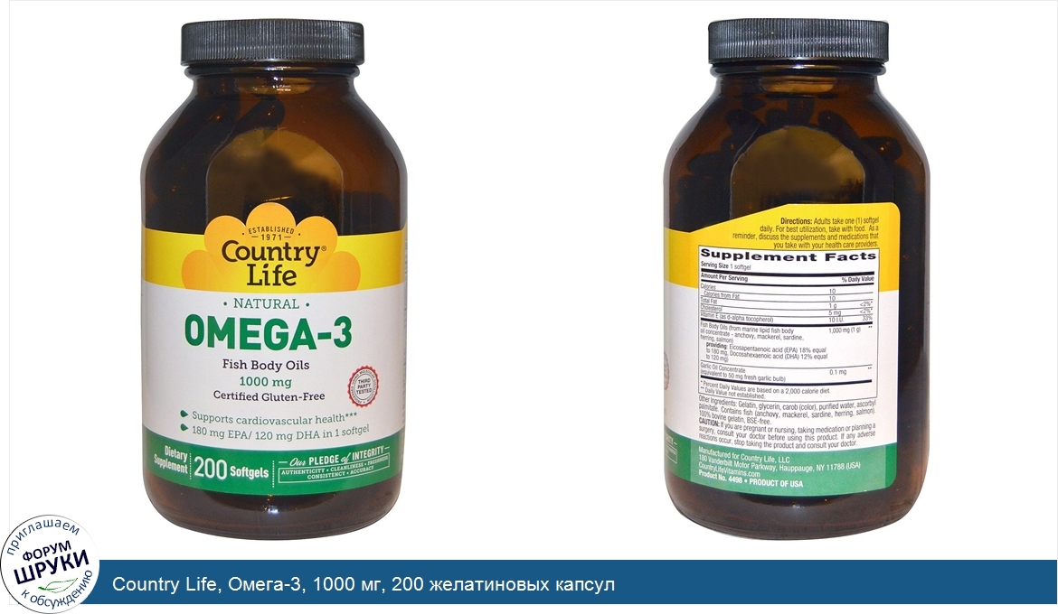 Country Life, Омега-3, 1000 мг, 200 желатиновых капсул