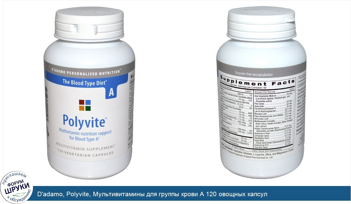 D'adamo, Polyvite, Мультивитамины для группы крови А 120 овощных капсул