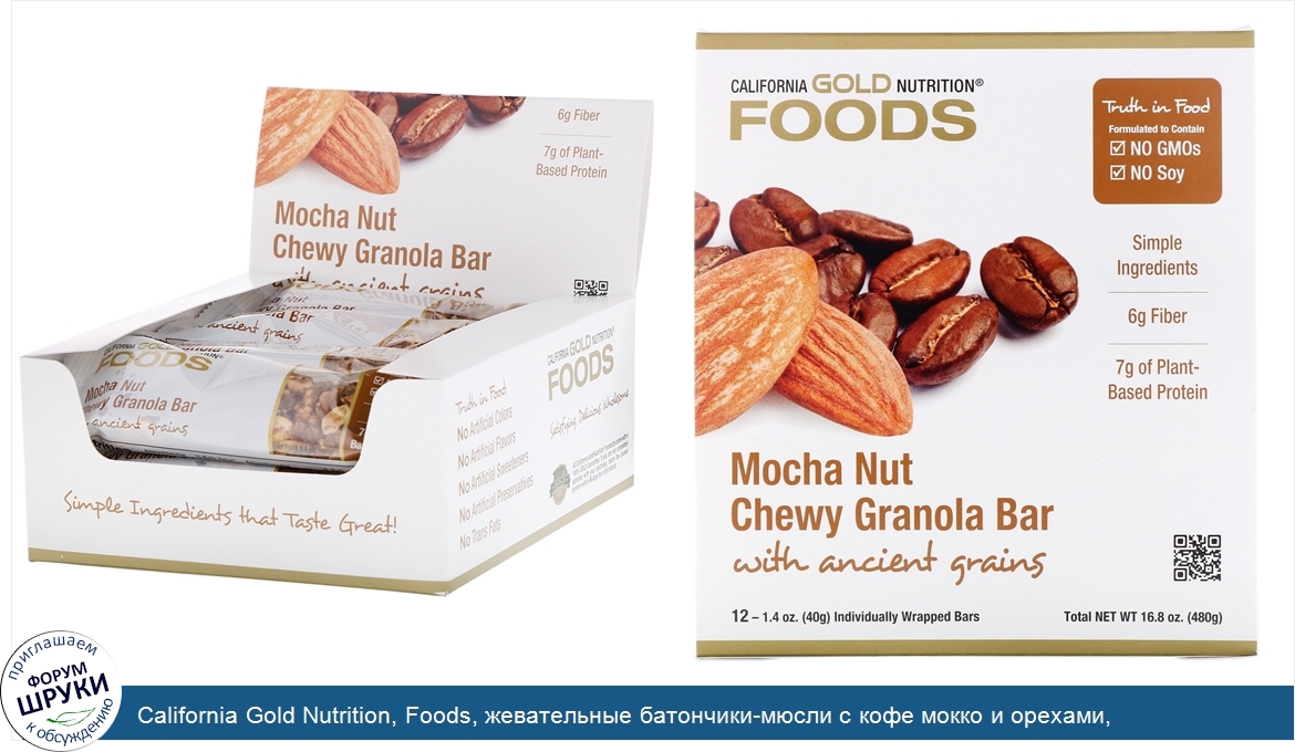 ru California Gold Nutrition, Foods, жевательные батончики-мюсли с кофе мокко и орехами, 12батончиков весом 1,4унции (40г) каждый