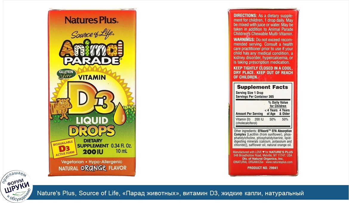 Друзья, если у вас есть отзыв/дополнение/комментарий/вопрос относительно Nature's Plus, Source of Life, «Парад животных», витамин D3, жидкие капли, натуральный апельсиновый вкус, 200 МЕ, 0,34 жидк. унций (10 мл) - напишите его ответом в эту тему (это будет полезно всему сообществу в целом и вам в отдельности).