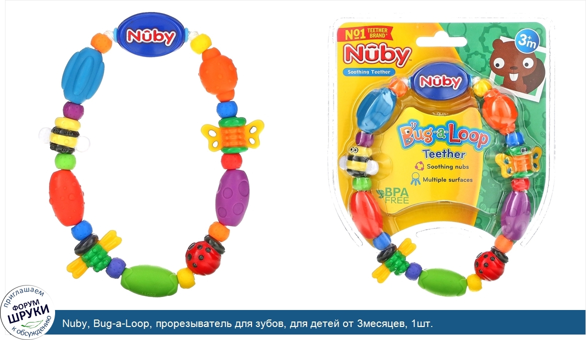 [DESCRIPT]No. 1 Teether Brand. Soothing Teether. BPA Free. Soothing Nubs. Massaging Nub-eez Soothe and Stimulate Gums. Multiple Teething Surfaces! The Bug-a-Loop teether by Nuby™provides textured surfaces for baby to bite and teethe on during teething periods. The teether is engineered with raised offset surfaces that assist in the emergence of teeth by gently massaging infant's gums. Colorful shapes are easy for baby to hold and sized for maximum effectiveness as a teether. Conforms to toy safety standard ASTM F963.[/DESCRIPT]... (описание дополняется)