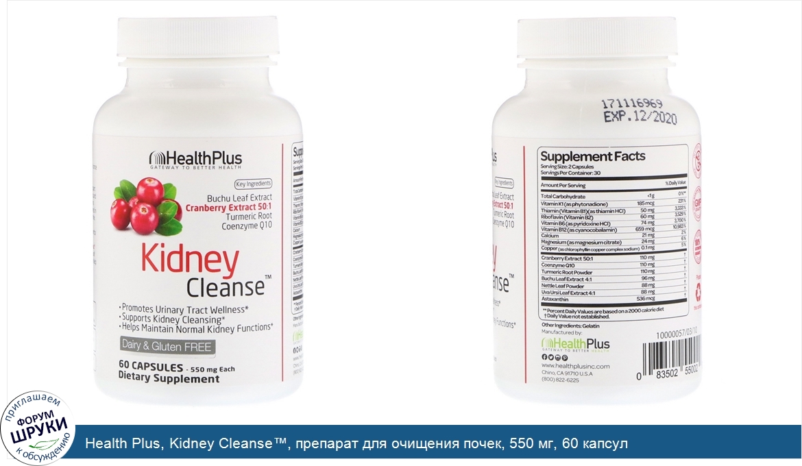 Категории: Health Plus Inc., Пищевые добавки, Состояния здоровья, Мочевой пузырь, Препараты для почек, Хэлс Плас Инк, 16020