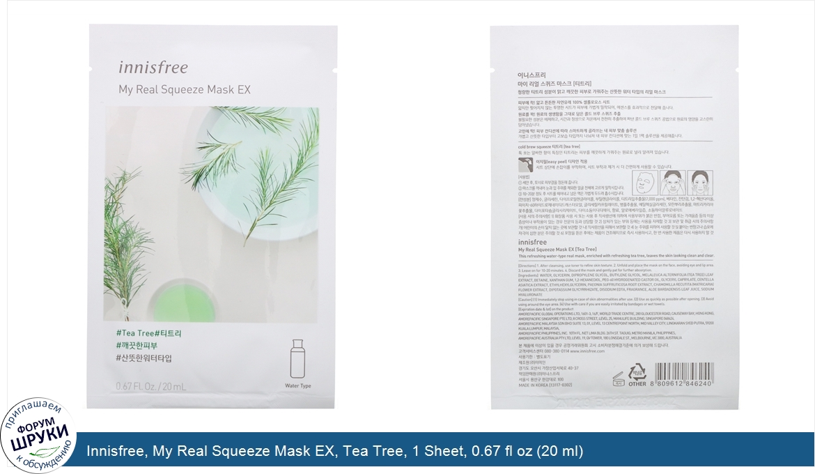 Друзья, если у вас есть отзыв/дополнение/комментарий/вопрос относительно Innisfree, My Real Squeeze Mask EX, Tea Tree, 1 Sheet, 0.67 fl oz (20 ml) - напишите его ответом в эту тему (это будет полезно всему сообществу в целом и вам в отдельности).