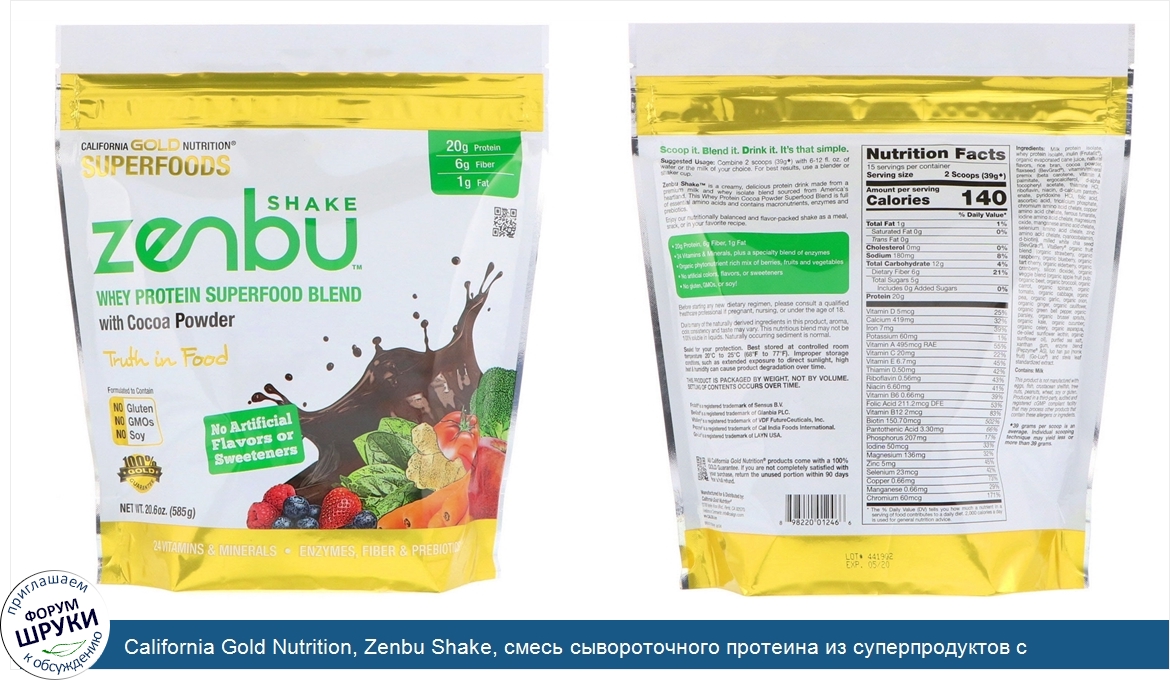 California Gold Nutrition, Zenbu Shake, смесь сывороточного протеина из суперпродуктов с какао-порошком, 1,3 фунта (585 г)