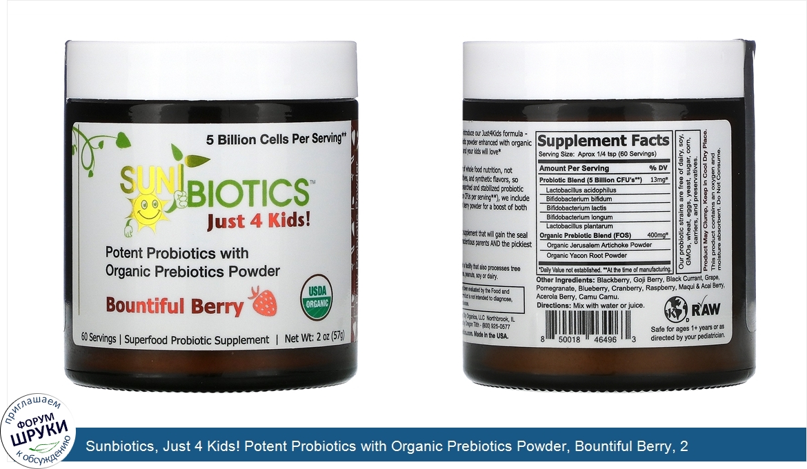 [DESCRIPT]5 Billion Cells Per Serving**. USDA Organic. Superfood Probiotic Supplement. Daily Probiotic Powder. Certified Organic by Oregon Tilth. Kosher Dairy. Raw. Sunbiotics is honored to introduce our Just4Kids formula - a potent dairy-free probiotic powder enhanced with organic prebiotics that both you and your kids will love. We believe in the power of whole food nutrition, not questionable fillers, additives, and synthetic flavors, so along with our 5 well-researched and stabilized probiotic strains (a total of 5 billion CFUs per serving**), we include organic, antioxidant-rich berry powder for a boost of both nutrition and flavor. The result is a probiotic supplement that will gain the seal of approval for both conscientious parents and the pickiest of taste buds.[/DESCRIPT]... (описание дополняется)