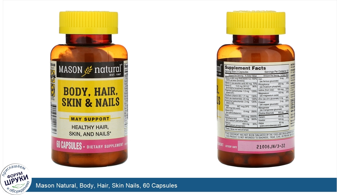 [DESCRIPT]Est. 1967. May Support Healthy Hair, Skin and Nails. Dietary Supplement. Soy Free. Mason Guarantee - Laboratory Tested. cGMP - Certified Good Manufacturing Practice.[/DESCRIPT]... (описание дополняется)