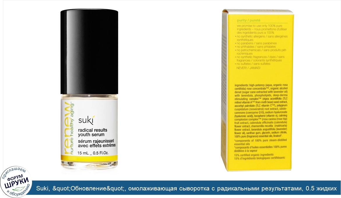Друзья, если у вас есть отзыв/дополнение/комментарий/вопрос относительно Suki, &quot;Обновление&quot;, омолаживающая сыворотка с радикальными результатами, 0.5 жидких унций (15 мл) - напишите его ответом в эту тему (это будет полезно всему сообществу в целом и вам в отдельности).