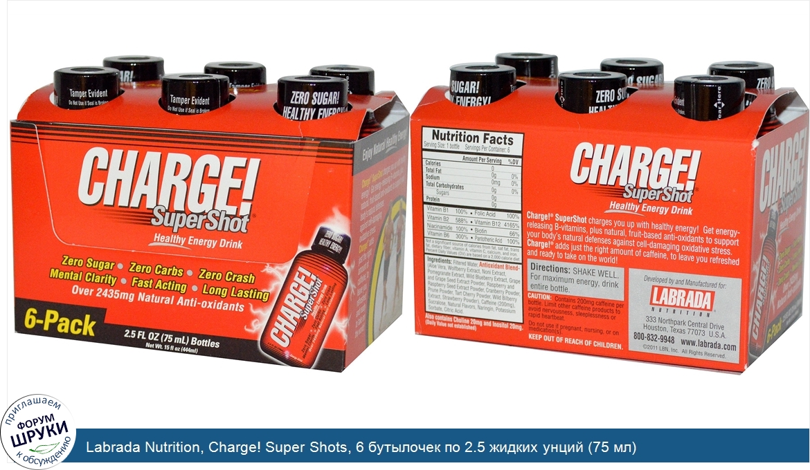 Labrada Nutrition, Charge! Super Shots, 6 бутылочек по 2.5 жидких унций (75 мл)