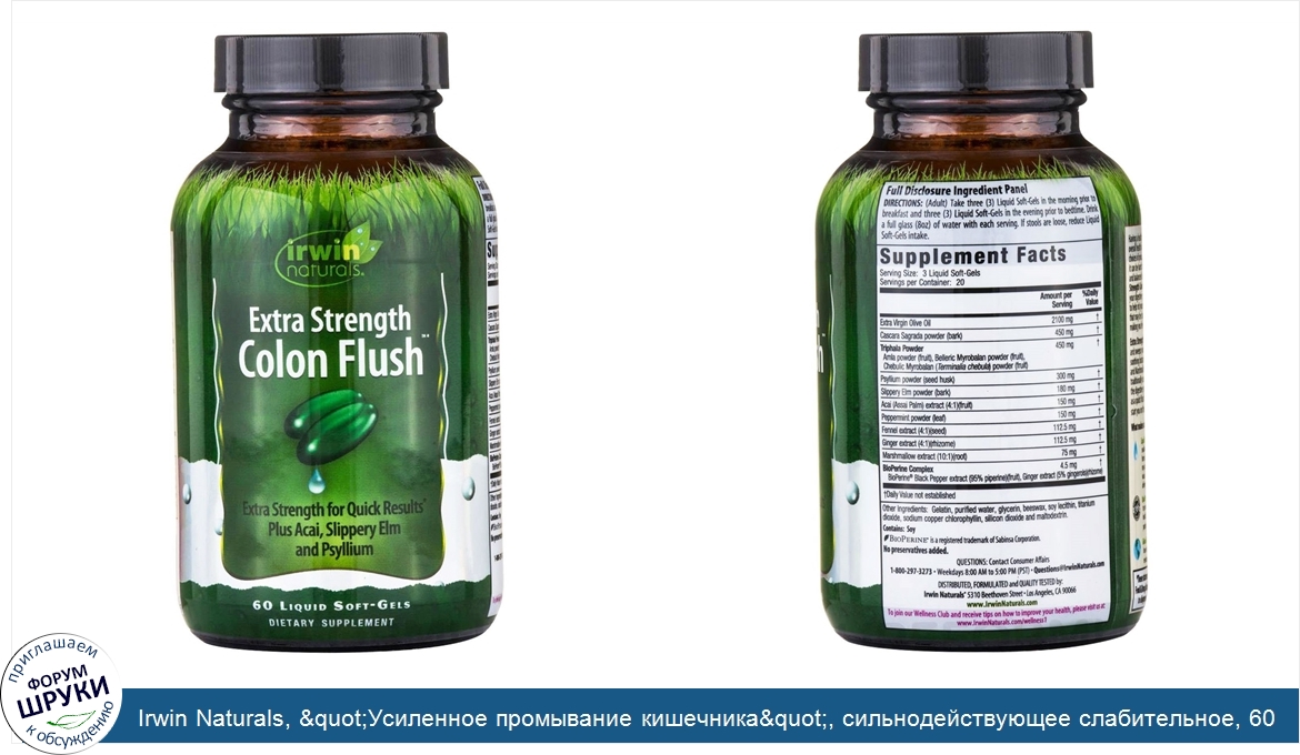 [DESCRIPT]Extra Strength for Quick Results Plus Acai, Slippery Elm and Psyllium. Dietary Supplement. Having a healthy digestive tract is important for overall health and well-being. But with today’s choices of processed foods and stressful lives, it can be hard to take the time to eat a healthy and balanced diet. That is why we created Extra Strength Colon Flush. It can be used to give your digestive system a quick and powerful flush to help rid yourself of harmful backed-up matter that may be clogging your digestive tract and making you feel tired and sluggish. Extra Strength Colon Flush not only cleanses and sweeps your digestive tract, it also supplies soothing botanicals such as Fennel Seed extract and Marshmallow Root extract, which have been traditionally used for their soothing properties in the digestive system. This product can be used as a quick flush for the digestive tract to help kick start you on the path to a happier, healthier you. What makes us different:. Liquid Soft-Gels. – The nutrients in these easy-to-swallow Liquid Soft-Gels are released fast. Other forms of delivery can contain binders and fillers that may cause stomach upset and offer no nutritional value. Advanced Liquid Soft-Gels provide an optimum delivery system. Quality Assurance. – Irwin Naturals is committed to providing the highest quality products for your health. We employ compliance testing to ensure purity and potency. Patented BioPerine. – BioPerine enhances the bioavailability, absorption and potency of many nutrients.[/DESCRIPT]... (описание дополняется)