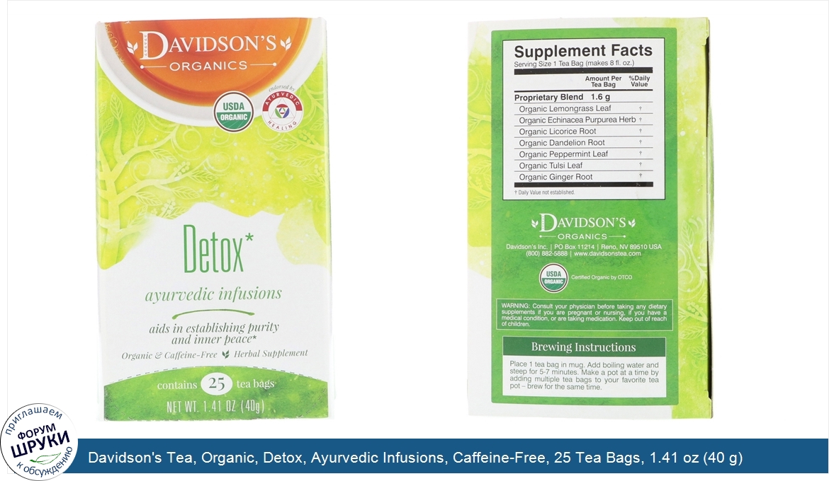 Друзья, если у вас есть отзыв/дополнение/комментарий/вопрос относительно Davidson's Tea, Organic, Detox, Ayurvedic Infusions, Caffeine-Free, 25 Tea Bags, 1.41 oz (40 g) - напишите его ответом в эту тему (это будет полезно всему сообществу в целом и вам в отдельности).