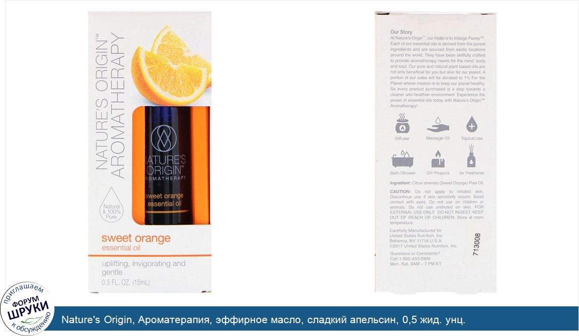 [DESCRIPT]Natural 100% Pure. Uplifting, Invigorating and Gentle. Not Tested On Animals. Non-GMO. Paraben Free. Gluten Free. Quality Assured. Sweet orange essential oil. Sweet Orange Oil is popular in use for aromatherapy. Nature's Origin Pure Sweet Orange essential oil is sourced from Brazil and is derived from the peels of oranges. The citrusy and tangy aroma of Sweet Orange oil immerses your senses in an uplifting fragrance. Sweet Orange oil has stimulating properties traditionally used for its invigorating purposes. Our Story. At Nature's Origin, our motto is to Indulge Purely. Each of our essential oils is derived from the purest ingredients and are sourced from exotic locations around the world. They have been skillfully crafted to provide aromatherapy needs for the mind, body and soul. Our pure and natural plant based oils are not only beneficial for you but also for our planet. Experience the power of essential oils today with Nature's Origin Aromatherapy![/DESCRIPT]... (описание дополняется)