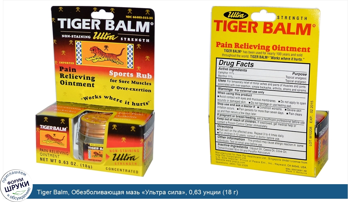 Друзья, если у вас есть отзыв/дополнение/комментарий/вопрос относительно Tiger Balm, Обезболивающая мазь «Ультра сила», 0,63 унции (18 г) - напишите его ответом в эту тему (это будет полезно всему сообществу в целом и вам в отдельности).