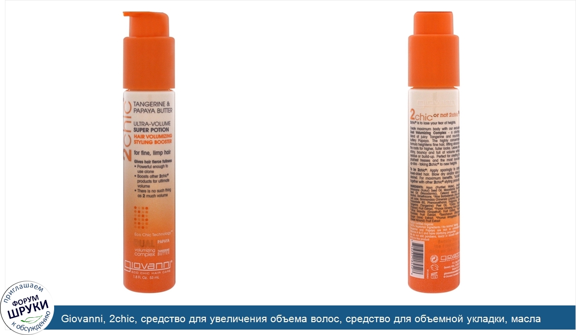 Друзья, если у вас есть отзыв/дополнение/комментарий/вопрос относительно Giovanni, 2chic, средство для увеличения объема волос, средство для объемной укладки, масла мандарина и папайи, 1.8 унций (53 мл) - напишите его ответом в эту тему (это будет полезно всему сообществу в целом и вам в отдельности).