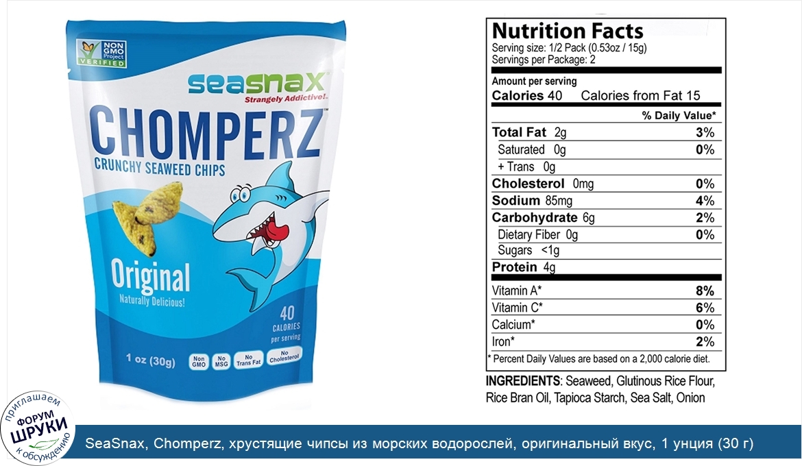 Друзья, если у вас есть отзыв/дополнение/комментарий/вопрос относительно SeaSnax, Chomperz, хрустящие чипсы из морских водорослей, оригинальный вкус, 1 унция (30 г) - напишите его ответом в эту тему (это будет полезно всему сообществу в целом и вам в отдельности).