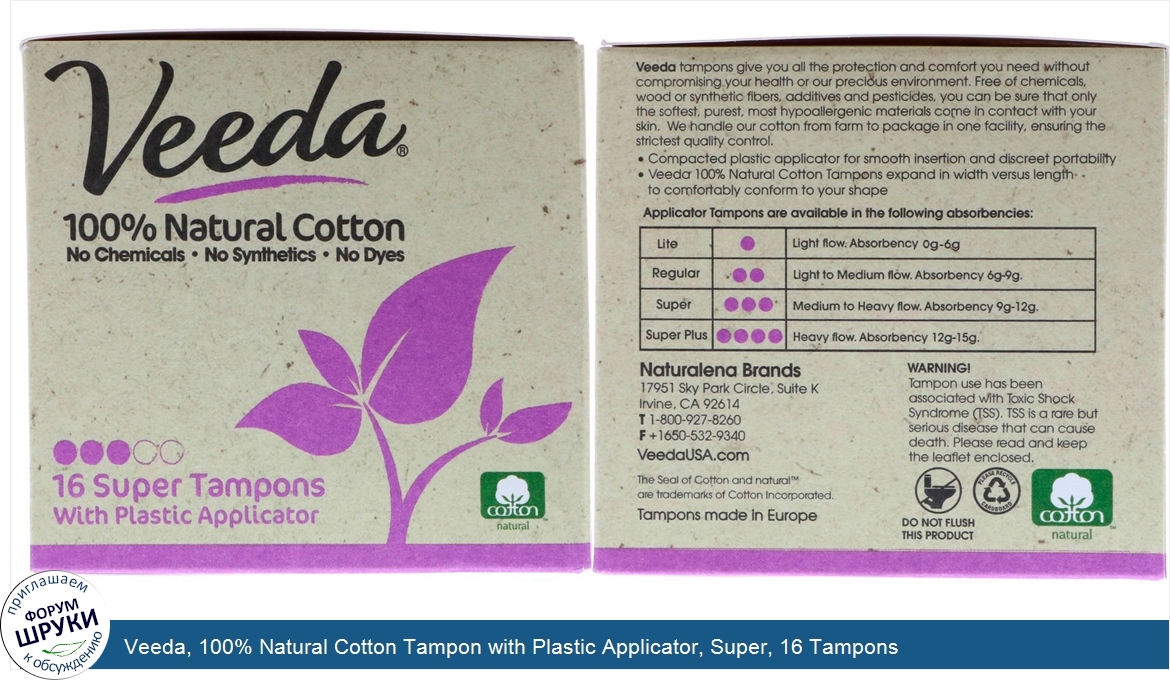 [DESCRIPT]No Chemicals. No Synthetics. No Dyes. Cotton Natural. It's Only Natural. Veeda. represents a new way of thinking about your body, your menstrual cycle and your health. It's about making choices that are smart and self-loving - good for you and food for the planet. We believe that every woman should be able to choose the purest, safest, most effective products for her body and minimize her risk of toxic shock syndrome and other side effects from chemical and synthetic products. Veeda. is committed to bringing healthy products, as well as life-enhancing opportunities, to women worldwide. Veeda. tampons give you all the protection and comfort you need without compromising your health or our precious environment. Free of chemicals, wood or synthetic fibers, additives and pesticides, you can be sure that only the softest, purest, most hypoallergenic materials come in contact with your skin. We handle our cotton from farm to package in one facility, ensuring the strictest quality control. Compacted plastic applicator for smooth insertion and discreet portability. Veeda 100% Natural Cotton Tampons expand in width versus length to comfortably conform to your shape.[/DESCRIPT]... (описание дополняется)