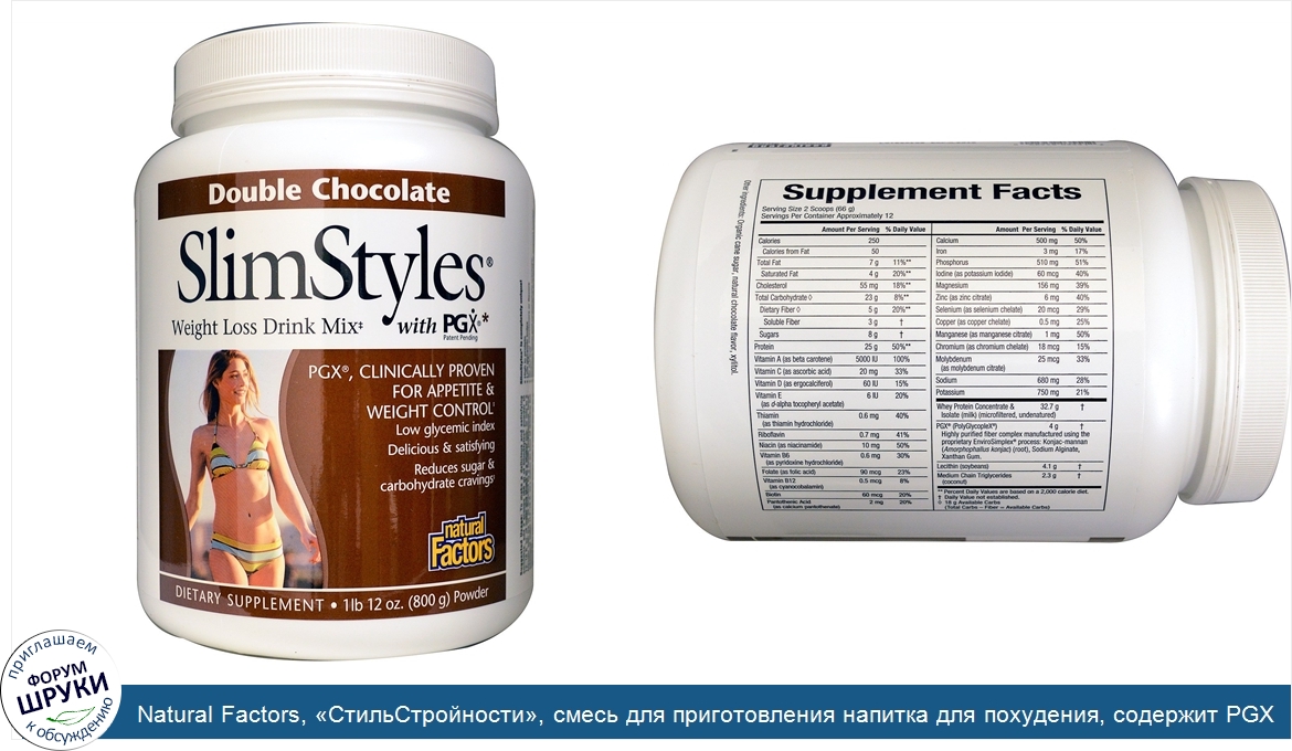 [DESCRIPT]PGX, Clinically Proven for Appetite Weight Control. Low Glycemic Index. Delicious Satisfying. Reduced Sugar Carbohydrate Cravings. Dietary Supplement. Purity Potency Guaranteed. Slim Styles is completely unique! . High in protein. Low glycemic index. No artificial sweeteners or flavors. Gluten free. Reduces sugar and carbohydrate cravings. Provides an optimum blend of nutrients to support healthy weight loss (when combined with a healthy diet and regular exercise). Slim Styles PGX - The Weight Control Breakthrough. The most important advantage of Slim Styles over other weight loss products is the clinically proven ingredient PGX. PGX (PolyGlycopleX) is a novel complex of water-soluble polysaccharides (plant fibers) that research has shown to safely and effectively support healthy blood sugar levels within normal ranges, reduce appetite and support weight management. *PGX is completely unique over other soluble fiber products in that significantly less PGX is required to obtain the same important health benefits, including appetite control and reduced food cravings. In addition, SlimStyles makes a delicious creamy shake in a jiffy that provides a full spectrum of essential nutrients and protein combined with PGX which helps to keep you full and satisfied for up to 4 hours. All Natural Factors products are manufactured in accordance with the Government of Canada's Good Manufacturing Practices (GMP), among the highest standards in the world.[/DESCRIPT]... (описание дополняется)