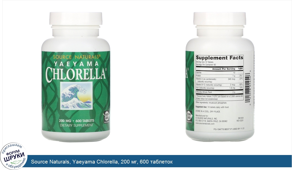 [DESCRIPT]Dietary Supplement. Non GMO Validated. Source Naturals Yaeyama Chlorella. ® contains non-GMO f. reshwater chlorella, grown on the coral reef island of Ishigaki, Japan. This superfood is a species of green algae and a great source of vegetarian vitamin B-12. It is also a good source of iron and vitamin A and a complete vegetarian protein. Chlorella gets its green color from the plant pigment, chlorophyll. Preliminary evidence, including some human research, suggests that chlorella may help support the health of the liver and the immune system.[/DESCRIPT]... (описание дополняется)