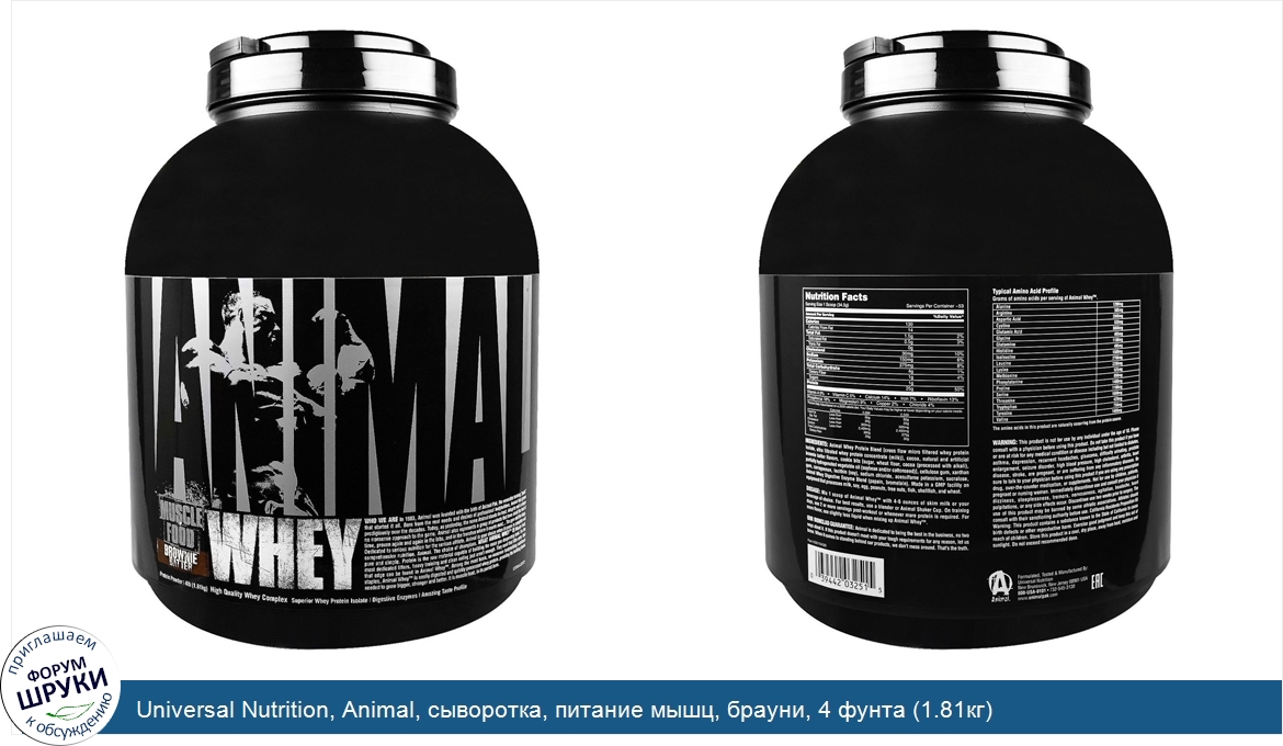 [DESCRIPT]Protein Powder. High Quality Whey Complex. Superior Whey Protein Isolate. Digestive Enzymes. Amazing Taste Profile. Who We Are. In 1983, Animal was founded with the birth of Animal Pak, the venerable training “pack” that started it all. Born from the real needs and desires of professional bodybuilders, Animal has grown prodigiously over the decades. Today, as yesterday, the name Animal stands for trust, integrity and a unique no nonsense approach to the game. Animal also represents a group of products that have stood the test of time, proven again and again in the labs, and in the trenches where it counts most… The gym and the stage. Dedicated to serious nutrition for the serious athlete, Animal is your choice when it comes to complete comprehensive nutrition. Animal. The choice of champions. What Animal Whey Is. Muscle food, pure and simple. Protein is the raw material capable of building the mass you desperately seek. For the most dedicated lifters, heavy training and clean eating just aren’t enough. They need that little extra. And that edge can be found in Animal Whey. Among the most basic, no-nonsense bodybuilding nutritional staples. Animal Whey is easily digested and quickly processed whey protein, providing the building blocks needed to grow bigger, stronger and better. It is muscle food, in its purest form.[/DESCRIPT]... (описание дополняется)