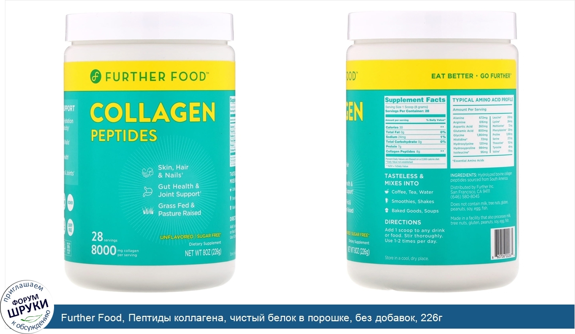 [DESCRIPT]Skin, Hair Nails. Gut Health Joint Support. Grass Fed Pasture Raised. 28 Servings. 8000 mg Collagen Per Serving. Sugar Free*. Dietary Supplement. Eat Better- Go Further. Elevate Your Wellness. Paleo Keto. Manufactured in NSF CGMP Facility. Kosher. Type 1 3. No Antibiotics Hormones. Dairy Free. Going Further For the Planet. A Women-Owned Business. Going Further for the Planet. Collagen, Made with Love. 3 Women started Further Food after discovering the power of real food too overcome chronic illness. Today, we work with our community of health experts to make whole food supplements that help you further your healthy lifestyle, naturally. Helps Support. Skin Hydration Elasticity. Hair Nails. Gut Health. Bones Joints.[/DESCRIPT]... (описание дополняется)